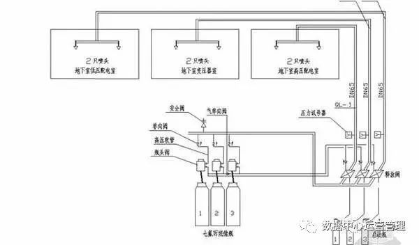 在不能使用水介質(zhì)來進行試驗的場所中,象本工程是安裝在變配電室那的,這種情況則可采用氣壓強度試驗代替,氣壓強度試驗壓力的0.8倍,或滅火劑初始噴射時系統(tǒng)的實際工作壓力的1.2倍進行。