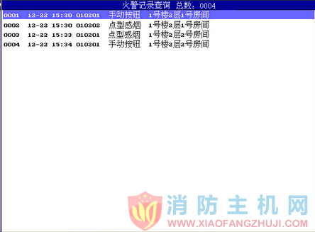 1.2.3 火警記錄查詢  進入“2、火警記錄查詢”,可檢查火警記錄信息,如圖1-6所示。每條信息包括序號、火警發生的時間、二次碼、設備類型及注釋信息。本控制器可查詢系統-新發生的1000條火警記錄信息