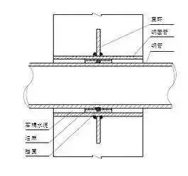 1.剛性套管安裝:主體結構鋼筋綁扎好后,按照給排水施工圖標高幾何尺寸找準位置,然后將套管置于鋼筋中,焊接在鋼筋網中,如果需氣割鋼筋安裝的,安裝后必須用加強筋加固,并做好套管的防堵工作。剛性套管安裝如圖所示: