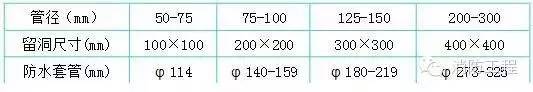 3.嚴格按照標準圖集加工制作防水套管、穿墻套管,套管長度按結構施工圖尺寸確定,套管管徑參照下列標準: